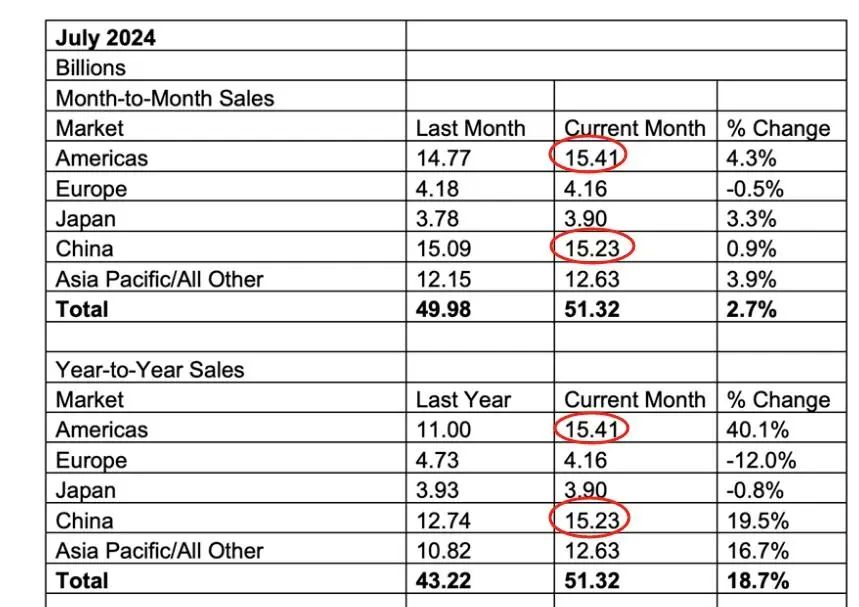 仔細(xì)分析具體數(shù)據(jù),環(huán)比上一個(gè)月,美國增長了4.3%,而中國只增長了0.9%;同比去年,美國增長了40.1%,而中國只增長了19.5%,這一對比凸顯了美國在近期半導(dǎo)體銷售領(lǐng)域內(nèi)的顯著反彈力和市場策略的有效性。此外,值得注意的是,歐洲市場在環(huán)比層面上呈現(xiàn)出下滑趨勢,同時(shí),歐洲與日本在同比表現(xiàn)上亦遭遇了負(fù)增長,這表明該區(qū)域可能正面臨供應(yīng)鏈挑戰(zhàn)、需求疲軟或技術(shù)創(chuàng)新周期的調(diào)整壓力,與美中市場的積極走勢形成了鮮明對比。