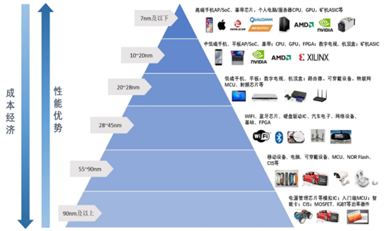 半導(dǎo)體制程以28nm為界線,分為先進(jìn)制程和成熟制程,不同工藝制程分別對(duì)應(yīng)不同的應(yīng)用領(lǐng)域。