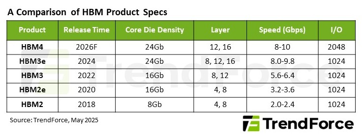 TrendForce指出,與前幾代產品相比,HBM4的I/O數(shù)量翻了一番,從1024個增加到2048個,同時保持了8.0 Gbps以上的數(shù)據(jù)傳輸速率。這意味著,由于通道數(shù)增加,HBM4可以在相同速度下提供兩倍的數(shù)據(jù)吞吐量。